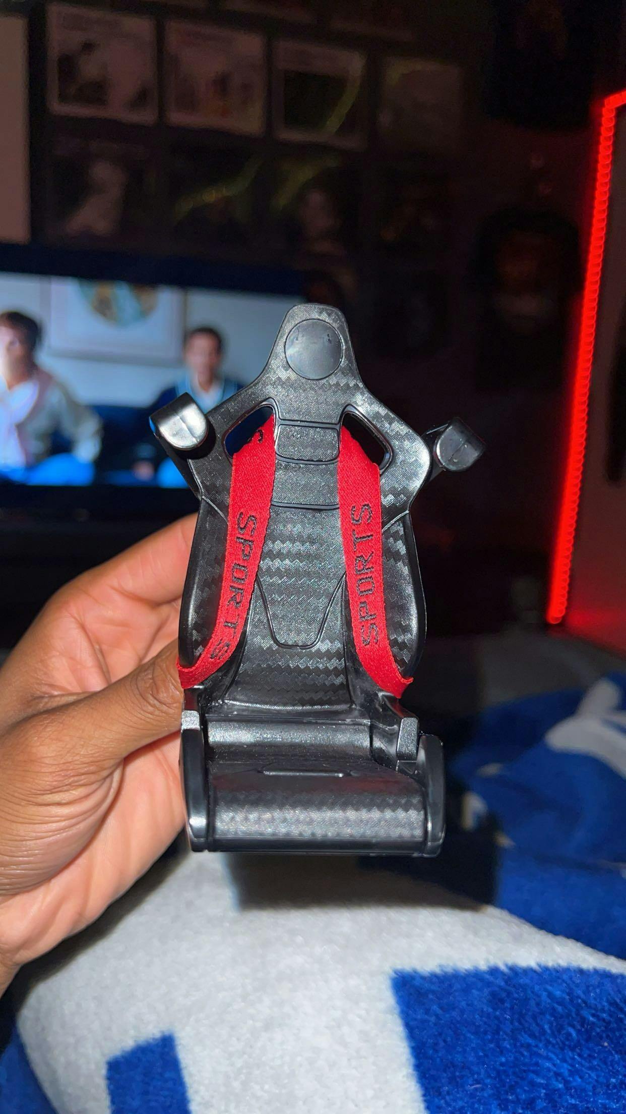 El soporte está fabricado con una textura de fibra de carbono e incluso viene con dos pequeños cinturones de seguridad. Puedes elegir entre el cinturón de seguridad rojo o el negro.